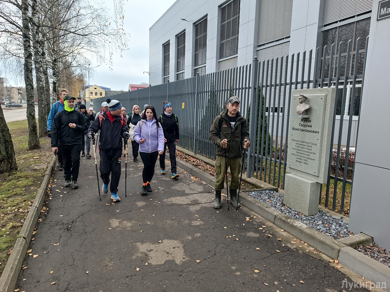 Выцеливая снова окраину города, дошли до улицы Маршала Жукова, где установлена мемориальная доска с бюстом Георгия Константиновича. Вскоре асфальт вместе с тротуаром закончились, взамен дали весьма приличную туристическую тропу.