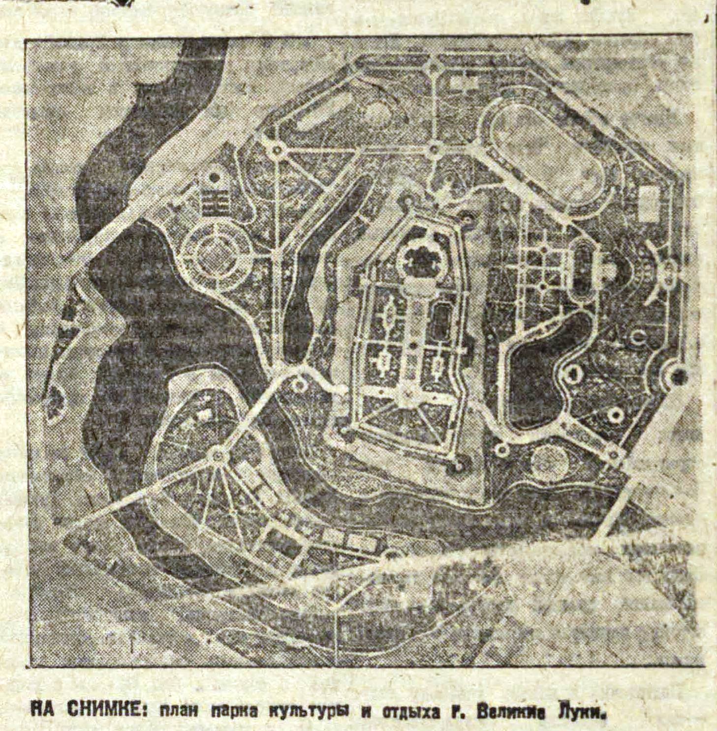 По новому генеральному плану города, утверждённому правительством, для парка культуры и отдыха запроектирована территория площадью 60 га. Место для будущего парка отведено в центральной части города. Парк займёт бывшую крепость, ров-овраг, широкой полосой в 300 метров окружающий крепость, остров Дятлинку и прибрежную часть, по правому берегу старого русла реки Ловать, до улицы Пушкина. Живописный рельеф местности с крутыми склонами к реке, расположенный посередине высокий холм крепости, река, пересекающая весь парк и окаймляющая остров, и прекрасная почва создают исключительно благоприятные условия для строительства парка. Парк по своим природным условиям и по своей площади будет значительно лучше и больше того, что имелось в городе до войны.