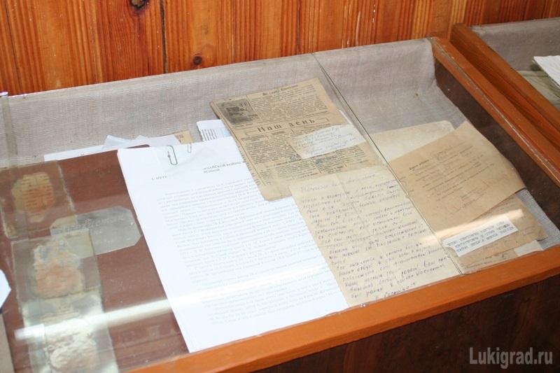 На стенах — фотографии, истории жизни людей и дивизий, на центральной витрине — военные схемы, в витринах, расставленных вдоль стен, - подлинные документы, письма, газеты времён войны.