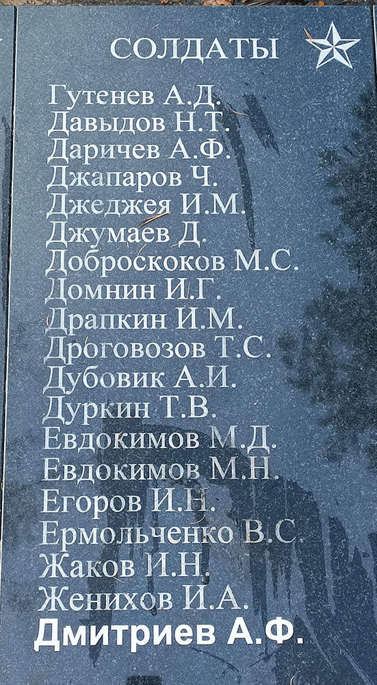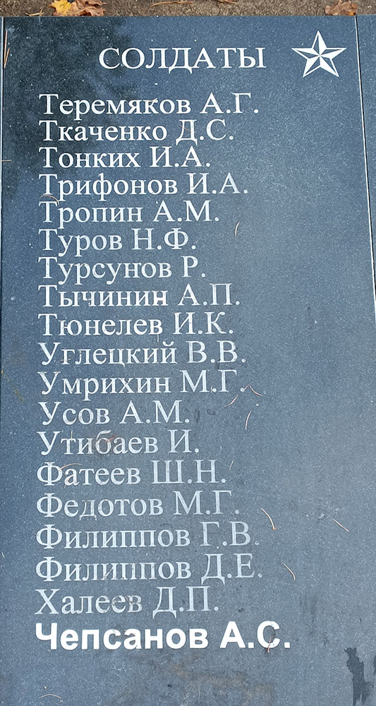 В том же списке захороненых, наш дед под 111 номером- Сарсенкулов Жумахан- 1917г.р.-17.01. 1943г., уроженец с. Болексаз, Кегенского района, Алматинской области, Республики Казахстаню Светлая память всем нашим предкам, кто покоится на земле Псковской области, Куньинского района, деревни Борок.