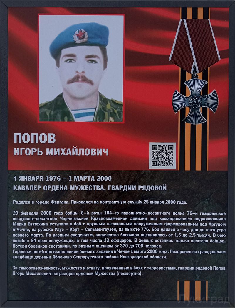 Бой у высоты 776 в ходе второй Чеченской компании стал последним для 84 десантников 6 роты 104-го гвардейского парашютно-десантного полка. С 29 февраля на 1 марта 2000 года 6-я рота, под командованием гвардии подполковника Евтюхина, вступила в бой со значительно превосходящим по численности отрядом чеченских и арабских боевиков, под руководством Хаттаба, в Аргунском ущелье на высоте 776 (в районе населённого пункта Улус-Керт, Сельментаузен). 28 февраля 2000 года командиром полковой группировки 104 гв. ПДП гв. полковником Милентьевым был отдан приказ командованием 6 роты гв. майору Молодову занять господствующую высоту Исты-Корд. На находящуюся в 4,5 километрах гору Исты-Корд были отправлены 12 разведчиков. 29 февраля в 12:30 разведгруппа под командованием гв. старшего лейтенанта Кожемякина вступила в бой с превосходящим по численности головным дозором банд.формирований и вынуждена была отойти к высоте 776. В этот же день рота выдвинулась и закрепилась на высоте 776, где и приняла бой с превосходящими силами противника. В самом начале боя командир роты гв.майор Молодов был смертельно ранен и погиб, а командование ротой принял на себя командир 2ПДБ гв. подполковник Евтюхин. В течении всего дня рота мужественно отбивала ожесточённые атаки в разы превосходящих сил банд формирований. Проявляя выдержку, хладнокровие, оставаясь верными воинскому долгу и присяге, гвардейцы десантники приняли для себя единственное правильное решение - стоять до конца и не пропустить боевиков. Оставшиеся в живых гвардейцы десантники, во главе с командиром батальона сосредоточились на вершине горы. Здесь, обескровленной, 6 ротой был принят последний бой. В 6:10 утра 1 марта 2000 года связь с командиром батальона прервалась. Последними словами гв. полковника Евтюхина были: "Вызываю огонь на себя......". Высоту накрыл шквал артиллерийского огня.